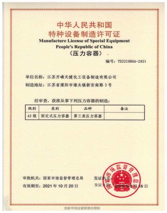8月28日,天建公司收到由國家市場監督管理總局頒發的編號為:TS2210H66-2021,有效期至2021年10月20日的A2級壓力容器制造許可證,獲準從事A2級固定式壓力容器第三類壓力容器的制造,標志著天健公司四年一次的壓力容器證復審換證工作圓滿完成。
